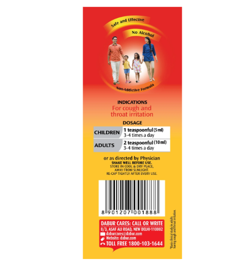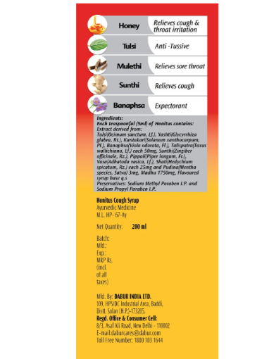 Dabur's Honitus Ayurvedic Cough Syrup provides effective relief from cough without causing drowsiness. Dabur Honitus Cough Syrup is Honey-based herbal cough syrup for adults that is fortified with Tulsi, Mulethi & Banapsha and other scientifically tested herbs..